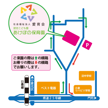教材費● 子ども達の活動に必要な費用は掛かりませんが、諸行事への参加(遠足や会費等)をお願いすることがあります。 給食費● 令和元年10月より、3歳以上児の保育の無償化に伴い、完全給食へ移行します。副食と主食をご提供します。副食費及び主食費は別途、費用がかかります。(副食費は市の補助により免除される場合が有ります) 送迎● 保護者の方が責任をもって行ってください。※お子様が急に発熱したり、体調がすぐれない場合には、お迎えをお願いすることがあります。 アクセス 認定こども園 あけぼの保育園〒800-0207 北九州市小倉南区沼緑町二丁目1-39TEL.093-473-3741 電車の場合日豊本線下曽根駅北口を出て、旧10号線を北へ徒歩約15分。※県道25号線よりベスト電器小倉支店の横道を上がる。電柱表示があり、約500メートルほど上がると、園への指示表示がある。指示表示より約20メートルほどで到着する予定。日豊 自動車の場合小倉東インターチェンジから約3km。※駐車場あり。※園近辺区域は、子ども達の安全のため、園の交通ルールのご協力をお願いしていますのでご理解ください。